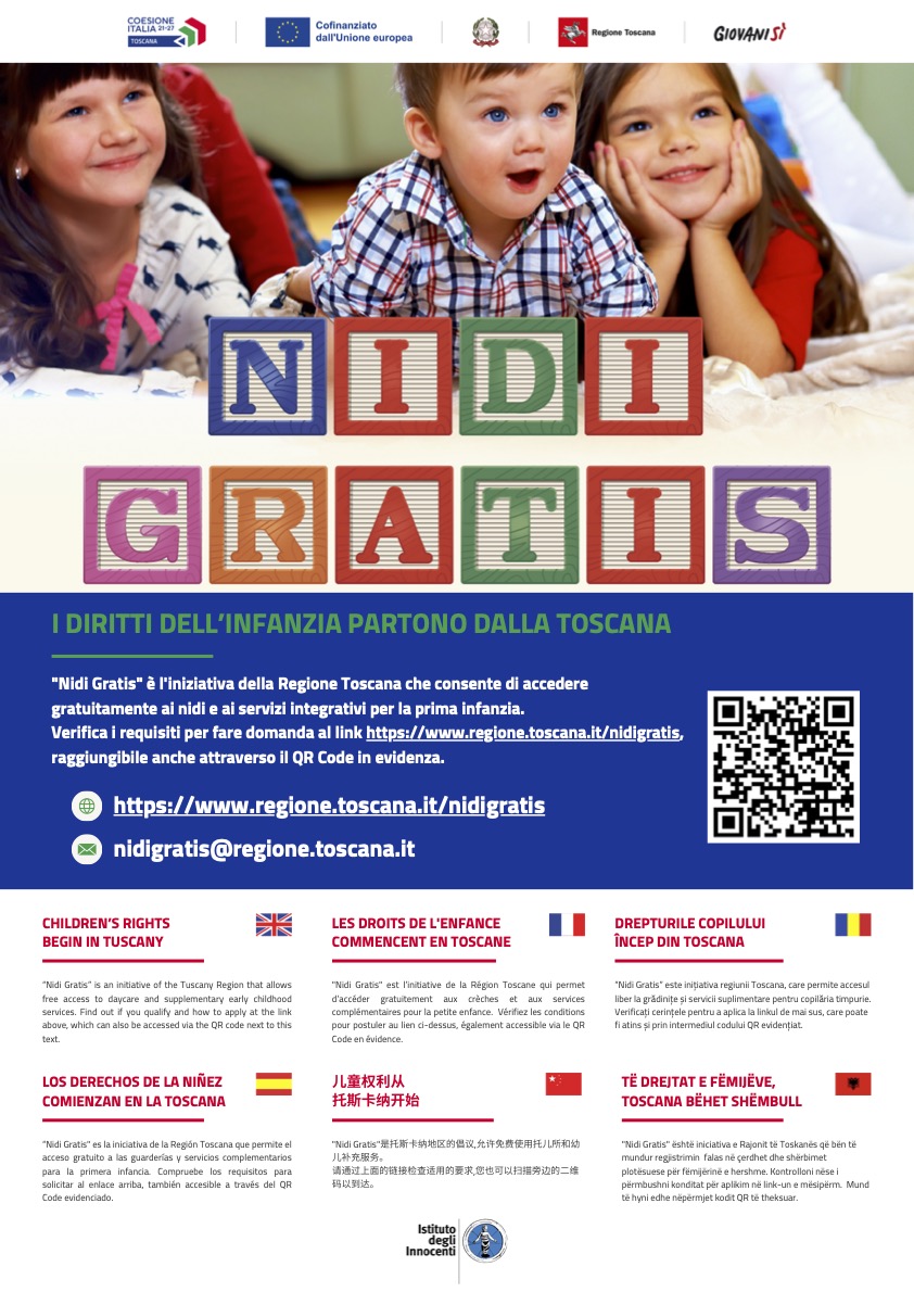 "Nidi Gratis" è la misura della Regione Toscana che consente l’accesso gratuito ai nidi e agli altri servizi educativi per la prima infanzia e che si pone l’obiettivo primario di aumentare la platea dei bambini e delle bambine che possono accedere al nido, quale occasione fondamentale di crescita e sviluppo, nonchè di favorire la conciliazione tra vita familiare e lavorativa e sostenere la genitorialità.